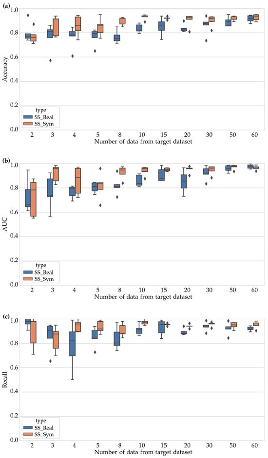 Comparison between the SS model obtained from simulations (SS_Sym) and the SS model obtained from experimental data (SS_Real). Evolution of (a) accuracy, (b) AUC, and (c) recall as the number of experimental data used in fine-tuning training increased.