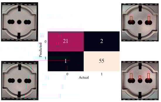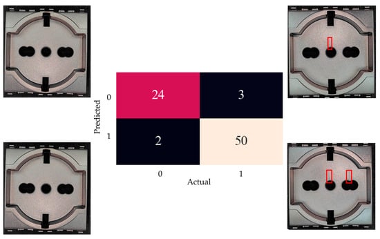 Finally, in Figure 6, it can be observed that the performance of the SS model pre-trained on synthetic data stabilized around 20 data points, whereas the control network achieved a comparable performance to this model only when approximately 50 data points from part 2 were utilized. On the other hand, from Figure 8, it can be seen that the SS model pre-trained on synthetic data stabilized its performance using only 10 data points for fine-tuning. In contrast, the control network matched the performance of this model only when employing 60 data points for knowledge transfer. The recent observations indicated a 60% reduction in the amount of part 2 data needed to train the neural network through transfer learning from simulation. Conversely, transfer learning from simulation extended this reduction to 83%. Transfer learning from simulation minimized the data points required for good forecasting capacity. Furthermore, this approach maximized cost efficiency compared to traditional training methods. The final performances of both SS models, achieved with 30 or more data points from part 2, were nearly identical. In Figure 10 and Figure 11, the confusion matrices for the TL from experimental and artificial data, respectively, are reported. For each cell of the matrix, an example of a component relating to the cell is shown. The matrices relate to fine-tuning with 60 data relating to part 2.