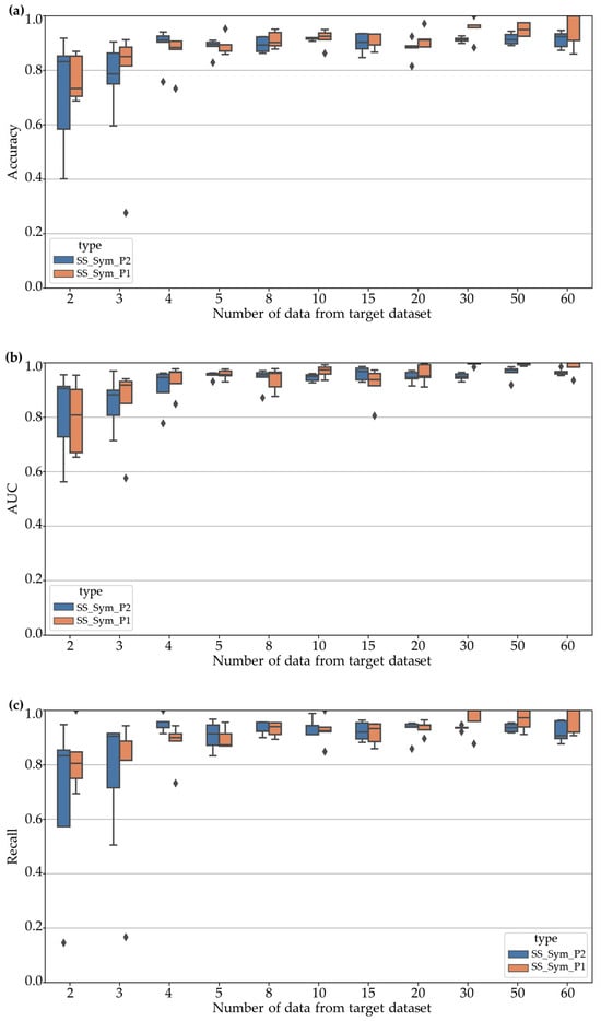 Comparison between the SS model related to part 1 (SS_sym_P1) and the SS model about part 2 (SS_sym_P2). Evolution of (a) accuracy, (b) AUC, and (c) recall as the number of experimental data used in fine-tuning training increased.