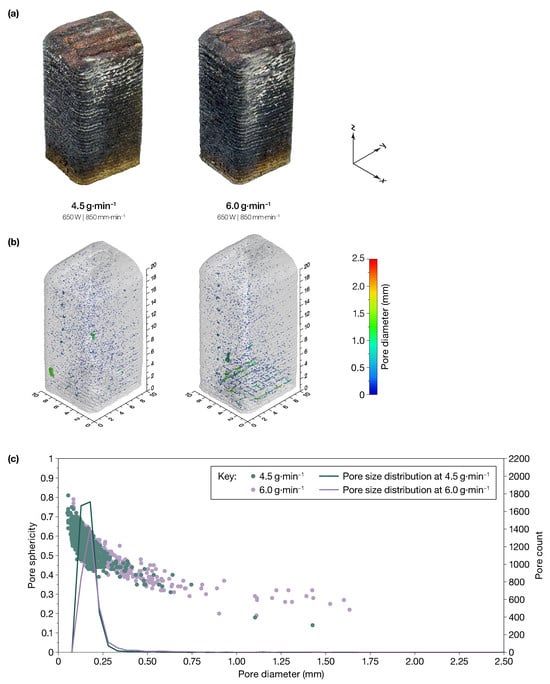 - The powder mass flow rate influenced both gas-induced pores and lack-of-fusion pores. In detail, the increase in powder mass flow rate led to a reduction in gas-induced pores and this was related to the reduction in melt pool depth. On the other hand, the lack-of-fusion pores increased due to a reduction in the melt pool width.