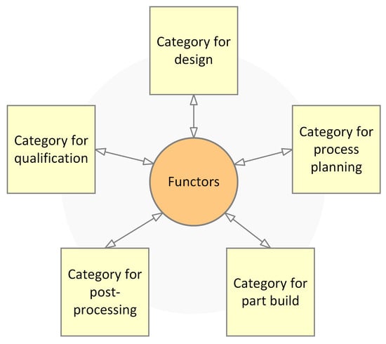 The LPBF part realisation process generally consists of five stages, which are design, process planning, part build, post-processing, and qualification. LPBF part data include all relevant data captured, used, and generated in these stages. In this section, a semantically enriched model of LPBF part data is presented using a CT-based modelling approach. The overall structure of the presented model is shown in Figure 2. The model consists of five categories constructed to represent the data in the five stages and twenty functors among these categories constructed to exchange the data among the five stages. In the following subsections, the details of each category will be explained.