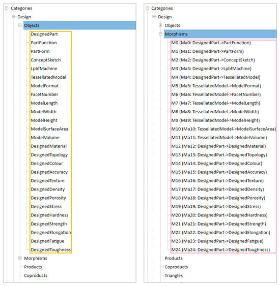 Based on the description above, a category for design named was constructed. This category consists of twenty-six objects and twenty-five morphisms. The details are shown in Figure 3.