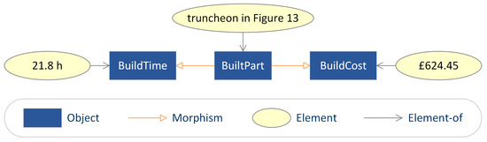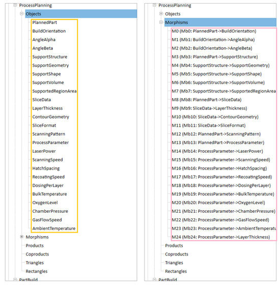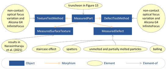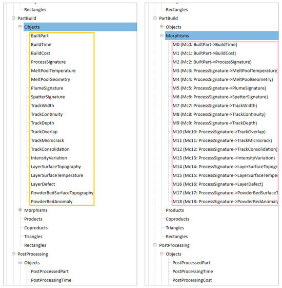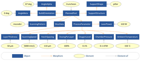 In the stage of part build for LPBF, two important data items are build time and build cost. Further, the data that have an important influence on the quality of the final product include a series of process signatures. According to the study of Liu et al. [22], these process signatures can be classified into melt pool signatures, by-product signatures, single track signatures, single layer signatures, and powder bed signatures. The melt pool signatures include melt pool temperature and melt pool geometry. The by-product signatures contain plume signature and spatter signature. The single track signatures include track width, track continuity, track depth, track overlap, track microcrack, and track consolidation. The single layer signatures contain intensity variation, layer surface topography, layer surface temperature, and layer defect. The powder bed signatures include powder bed surface topography and powder bed anomaly. Based on the description above, a category for part build named was constructed. This category consists of twenty objects and nineteen morphisms. The details are shown in Figure 5.