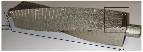 The last step is to represent the data in qualification. The surface texture and defect of the built truncheon were measured using a non-contact optical focus variation method and the Alicona G4 InfiniteFocus system. The configuration of the focus variation measurement is listed in Table 3. The magnification and measurement area were chosen with the goal of capturing the representative fraction of the surfaces, which is appropriate for characterising the staircase effect as well as for the identification and quantification of many particles and spatter formations. The ring light was employed not only to prevent overexposure but also to capture the distinct flank features. After taking measurement readings at three distinct locations for each incremental angle surface, the mean values and standard deviations were calculated. Four repetitions of the measurement at zero degrees were made in order to confirm the repeatability error. The surface texture data were analysed using Digital Surf MountainsMap. The results of the surface texture analysis help to characterise the particle characteristics and staircase effect. Filling the non-measurement spots and, then, least square levelling were the first steps in processing the imported measurement data. After that, the λs filter with a nesting index of 5 μm was used to filter out the short spatial wavelength components, which include measurement noise and fine surface details. Similarly, because of its resilience against outliers, a robust Gaussian filter with a nesting index of 80 μm was used to isolate the characteristics of the particles from the underlying staircase surface. A few non-measured points were observed in optical measurements, mainly due to the shape local surface gradient. These missing points could be filled by the nearest neighbour interpolation. However, the interpolated points are not included in the roughness parameter calculation. The areal surface texture parameters explored in this work are listed in Table 4. The measured parameters was documented in [64]. The measured defects include the staircase effect, spatters, unmelted and partially melted particles, and balling. Based on these data, eight elements, as shown in Figure 15, were created in the category.