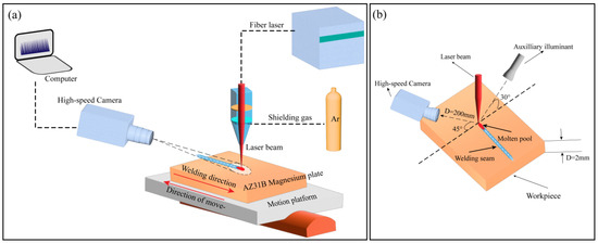 The laser welding of magnesium alloys is an important task in industry. The widespread recognition of magnesium alloys stems from their exceptional specific strength [1,2], thermal formability, and excellent machinability, rendering them highly valuable in various industrial applications such as the aerospace and automotive industries [3]. Laser welding, characterized by its high-energy density heat source, offers advantages including localized heating, a minimal heat-affected zone, and narrow weld seams, thus garnering considerable attention in the welding processing of magnesium alloys.
