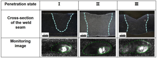 In this study, the melting states were classified into three categories, namely I, II, and III, corresponding to the under-penetrated (UP), fully penetrated (FP), and excessive-penetrated (EP) states, respectively. As illustrated in Figure 2, the two regions in the monitoring images (the green dashed line) represent the overall melt pool area (the bigger one) and the keyhole area (the smaller one), respectively.