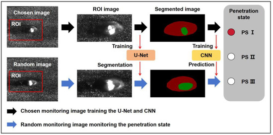 An overview of the proposed melt penetration state monitoring method is presented in Figure 3, which primarily includes two components based on deep learning: image semantic segmentation using U-Net and penetration state prediction based on CNN. The U-Net model segmented the real-time captured monitoring images to extract the melt pool and keyhole, which were then analyzed using a trained CNN model to predict the corresponding penetration state. It was observed in the experiments that changes in the power of the composite laser led to different welding states of the magnesium alloy material, resulting in variations in the width, depth, and shape of the magnesium alloy weld seam. Correspondingly, changes were observed in both the melt pool and keyhole. The relationship between the monitoring signals from the melt pool and keyhole and the welding seam and melting states of the magnesium alloy will be further investigated.