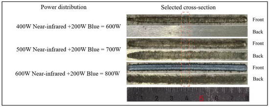 Figure 4. The morphology of welding seams at different laser powers. The red dashed lines correspond to each section in Figure 2.