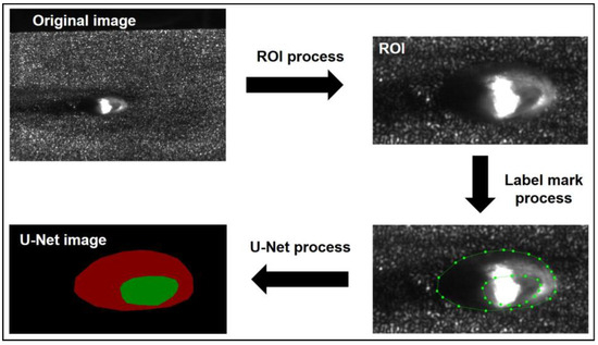 Figure 6 presents the weld seam images of the magnesium alloy obtained under different combinations of near-infrared laser and blue laser powers at a welding speed of 15 mm/s. During the welding process, over 4000 images were acquired. After excluding transitional images at the beginning and end of the welding stages, 1500 images were included in the dataset, with 500 images processed for each condition. Due to the high resolution of the original monitoring images (1280 × 1024 pixels) and the small size of the melt pool area, the preprocessing of the original images was conducted as shown in Figure 7. Initially, the images were cropped to regions of interest (ROIs); this was followed by processing the ROI images using LabelMe to obtain label data. Then, 90% of the label data was chosen as the training set for the U-Net model, while the remaining 10% was utilized as the validation set. Finally, after training the U-Net model, the classification of targets in the input images was divided into three categories: keyhole, melt pool, and background.
