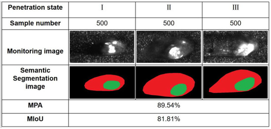 The U-Net model was employed to segment 1500 original monitoring images. Figure 8 illustrates segmented images under three different penetration states, and Figure 9 displays the evaluation metrics of the U-Net segmentation. In this paper, we evaluate the U-Net model using two metrics, namely the Mean Pixel Accuracy (MPA) and the Mean Intersection over Union (MIoU). MPA calculates the percentage of correctly classified pixels in a semantic segmentation task. MIoU computes the intersection over union (IoU) for each class and then takes the average across all classes to evaluate the segmentation accuracy in computer vision tasks. Strong metallic vapor plume interference in the fused images was eliminated, with clear boundaries between the keyhole (inner region) and the melt pool (outer region) although optical noise interference persisted in the images, particularly in the reflective parts of magnesium alloy. The intensity of interfering parts varies across different monitoring images and approaches the brightness values of certain regions within the melt pool, making the accurate segmentation of the melt pool boundary challenging. The use of traditional methods to obtain the melt pool boundary is susceptible to inaccurate results due to the influence of optical noise. In contrast, the pixel-level semantic segmentation method based on the U-Net model in monitoring images yields segmented images with the precise boundaries of the melt pool and keyhole. The shapes of the melt pool and crucial hole in the segmented images closely resemble those in the ground truth images.