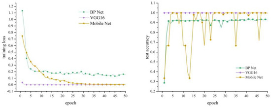 Figure 10 depicts the training loss and testing accuracy of the three models during the training process. It can be observed from the figures that due to the pre-training of VGG16, it achieved 100% accuracy after only 2–3 iterations of formal training. In the training process of the lightweight MobileNet, although the loss gradually decreased on the training set and the training accuracy reached 100%, the performance on the validation set was highly unstable, exhibiting clear signs of overfitting. The BP neural network also achieved 100% accuracy during training but maintained an accuracy of approximately 92% on the validation set.