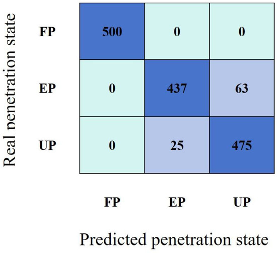 Figure 11. Confusion matrix of BP neural network. The model can predict 100% of the state of FP accurately, and the error is due to the misjudgment between UP and EP.