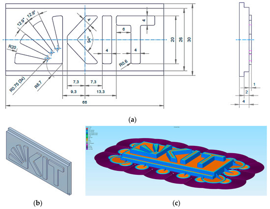 According to preliminary printing trials, the MEX printing of very fine structural details was omitted due to poor printing results. As the first mold insert design, the KIT logo was selected, containing different elements, like a fan-type structure, as well as different letters (Figure 1a). Alle features are elevated on top of the base plate (26 × 66 mm2) with a height of 1 mm. The ground plate of the mold insert has a standard size of 30 × 66 mm2, ruled by the die plate in the molding tool. There are no integrated ejector slopes, and the upper edges do not have a radius. The total height of the mold insert is 5 mm, covering the ground plate (height 2 mm), the base plate (height 2 mm), and the structure for replication (height 1 mm). The step between the ground and base plate is necessary for mold insert clamping in the molding tool die plate. Figure 1b shows a 3D image for better visualization, and Figure 1c shows an STL file with all auxiliary structures, like the brim.