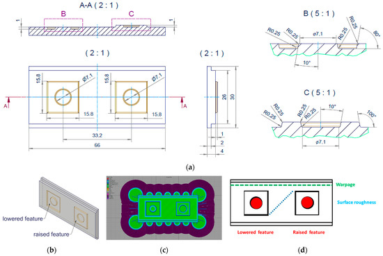 Mold insert type 2: (a): Engineering drawing with unit mm; (b) 3D view; (c) used STL File; (d): surface roughness and warpage measurement positions.