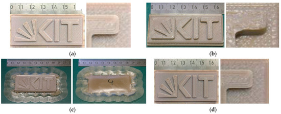 One important criterion for the usage of a mold insert in injection molding is the overall warpage along the longitudinal side (total length of 66 mm; see green line in Figure 2d). The mold inserts carrying the KIT Logo, printed according to printing strategy (d), showed an overall warpage of 301 µm, and the mold insert type 2 possessed a warpage of around 271 µm. Despite the fact that all mold inserts had the same maximum total height and were printed with a brim for better adhesion on the built platform, the observed warpage values were scattered in a certain range. If the warpage is too large, the mold insert cannot be positioned in a proper way in the die plate of the injection molding tool.