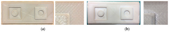 Following the optimized printing parameters found in the previous section, a different test geometry was selected, carrying simple raised and countersank structures to avoid geometrical elements that are too fine. In addition to support demolding, a 10° ejector slope and a radius at the upper edges were implemented. As in the previous case, a variation of the infill from the bottom towards the top surface for warpage avoidance was applied. The used printing conditions with a nozzle diameter of 0.4 mm are listed in Table 6 and are almost identical to strategy (d) described in Table 5. Directly after printing, the traces coming from the filament deposition can be seen by visual inspection (Figure 4a). Therefore, and with respect to better replication, the surfaces facing the feedstock were ground after printing manually as well, which allows for a smoother surface (Figure 4b). The positive effect of the grinding procedure is depicted in the right images (zoom in) of Figure 4a,b. A significant leveling of the surface topology is obvious and should be helpful for successful molding trials.