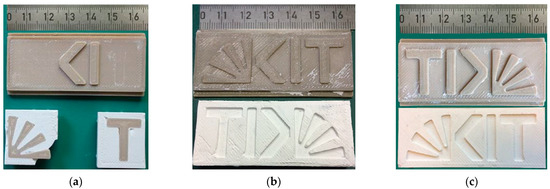 A manual demolding trial caused delamination of the top surface structures of the mold insert, which could be attributed to the previously described undercuts at the elevated top structures and the poor adhesion on the ground plate originating from the selected printing strategy. The strategy with the focus on enhanced adhesion (b) enabled a successful demolding, but the mold insert’s rough surface was copied to the surface of the molded ceramic green body as well (Figure 6b). Consequently, traces of the feedstock were stuck at the mold insert’s surface following the texture originating from the last printed filament layer, which increased the adhesion of the solidified feedstock in the subsequent molding trials. As a result, the number of successful molding trials (<5) prior to mold insert removal and cleaning is limited. The enhanced parameter variation in variant (d) with the additional surface postprocessing delivered a reduced surface roughness, enabling an improved quality of the resulting green body (Figure 6c), here with the inverse KIT logo structure. A series of five parts could be molded prior to mold insert removal and cleaning.