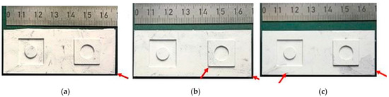 The deterioration of the PEEK mold inserts used for the three ceramic series was inspected visually, and the surface roughness of the elevated and lowered round structures was measured as described in Figure 2d. Figure 10 shows the mold insert type 2 after finishing all ceramic series and subsequent cleaning. The red arrows highlight some small defects; here, there is detachment of the upper printed layers, especially at the corners facing the clamping site of the metal die plate in the injection molding tool. These damages may be attributed to the coefficient of thermal expansion mismatch between the steel die plate and PEEK, causing pronounced mechanical tension generation in the PEEK mold insert during thermal cycling between the molding and demolding temperatures. The sharp corners and edges of the elevated and lowered structures are still intact.