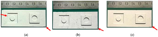 Ceramic series 2: The adjustment of the changeover pressure from 246 bar to 265 bar targeted a better mold filling in the case of ceramic series 2. As in ceramics series 1, almost identical defects could be observed (Figure 8a–c). The observable discoloration originates in the applied mold release agent. The fifth molded part showed some pronounced surface defects at the base plate; as a consequence, the molding trials were stopped. The increase in the changeover pressure caused a slight improvement in the replicated molded part quality.