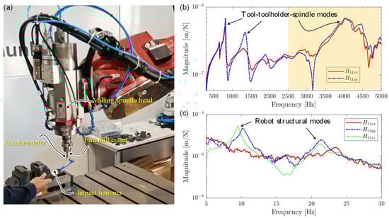 (a) Experimental setup for modal testing of robotic milling machine. (b) Direct FRFs at the TCP in the X- and Y-directions [yellow shade represents approximate FRFs beyond half power spectrum]. (c) Direct FRFs at the TCP in X-, Y-, and Z-directions showing robot structural modes.