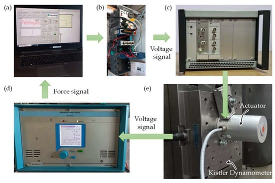 Experimental setup for characterizing the actuator. (a) Signal generation and data recording using LabVIEW. (b) Compact RIO controller with analog I/O modules. (c) Power amplifier of the actuator. (d) Charge amplifier of the dynamometer. (e) Actuator mounted on the dynamometer.
