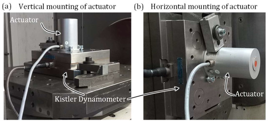 The experimental setup for characterizing the actuator is depicted in Figure 3. The actuator was securely mounted onto the Kistler Dynamometer (Model: 9255B, SN: 485906) to ensure stability and accurate force measurements. The primary objective of this study was not to measure spindle-speed-dependent cutting forces or actuator forces. Instead, we focused on measuring the actuator force within the frequency range of 1 Hz to 200 Hz to determine its natural frequency and bandwidth. To generate the necessary input signals for testing, LabVIEW 2021 was employed; see Figure 3a. Sine chirp signals at various voltages were generated, covering a wide frequency range. This comprehensive range allowed for a thorough characterization of the actuator’s performance across different frequencies. To facilitate data acquisition and signal transmission, a Compact RIO controller (Model: NI cRIO 9047) was utilized as depicted in Figure 3b. It integrated an analog-to-digital converter (Model: NI 9232) to receive the force signal from the Kistler dynamometer, which came through a charge amplifier. Simultaneously, a digital-to-analog converter (Model: NI 9263) was employed to transmit voltage signals to the actuator via a power amplifier (Figure 3c). The actuator force is obtained through the charge amplifier of the dynamometer, which converts the voltage signal into a force signal by multiplying it with the sensitivity, as illustrated in Figure 3d,e. Given that the working configuration of the robot varies depending on the specific use case, the actuator was tested exclusively in both vertical and horizontal orientations, as illustrated in Figure 4.