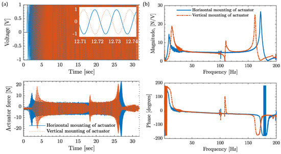 Time and frequency characteristics of actuator in horizontal and vertical mounting of actuator. (a) Measured time domain signal of input voltage and output force from the actuator. (b) Estimated force-to-voltage frequency characteristics of the actuator from the measured time domain signal.