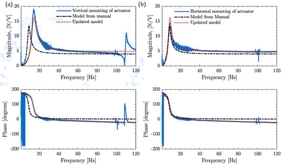 In this way, model parameters of the actuator in horizontal and vertical configuration of the actuator have been tuned manually and identified as listed in Table 2. It is noted that only the natural frequency of the actuator changes when we change its mounting configuration. The model fitted frequency responses along with the measured FRFs for both mounting configurations are shown in Figure 6.
