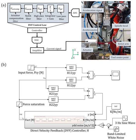 The schematic diagram and a Simulink model illustrating the closed-loop active damping model of the robotic milling machine can be observed in Figure 8a and Figure 8b, respectively. To conduct the entire active damping experiments, one position of the robot was specifically chosen, as detailed in Section 2. In this study, a well-established non-model-based direct velocity feedback (DVF) control law, previously documented in references [18,19,27,28,32], was utilized.