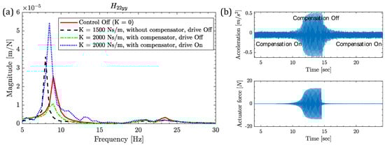 (a) Direct FRFs of the robot at the actuator mounting location () with compensation On/Off and drive On/Off, (b) Time domain accelerations and actuator force with compensation On and Off. In this case, the drive was Off and K = 1500 Ns/m.