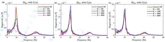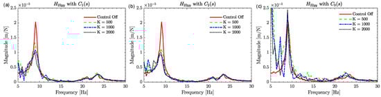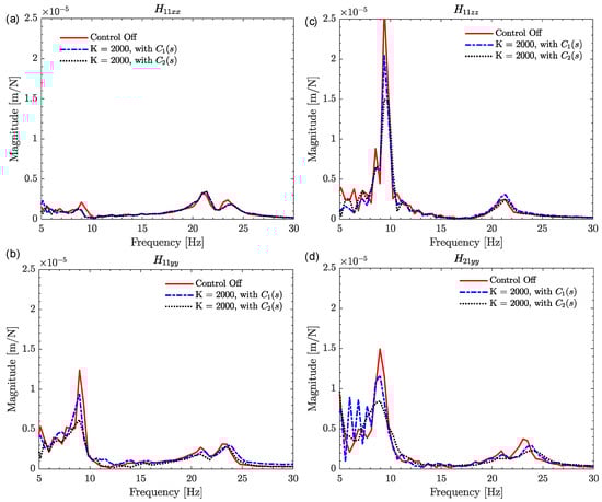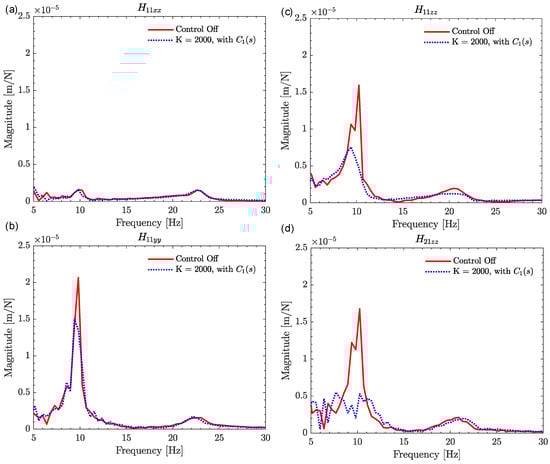 In the case of the vertical mounting configuration, the actuator is oriented in the Z-direction. Hence, Figure 13 shows the direct frequency response functions (FRFs) in the Z-direction () at the actuator mounting location (AML) for various compensation filters and control gains.