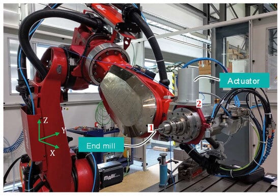 Due to substantial workspace flexibility, cost-effectiveness, and reduced setup time, industrial robotics has become increasingly popular, particularly in milling large, lightweight aerospace components and metal additively manufactured parts, and finishing and polishing operations. However, robots exhibit lower static and dynamic stiffness compared to conventional machine tools, hindering their application in various machining processes [1,2,3,4]. This lack of dynamic stiffness in robotic milling systems leads to regenerative chatter even at minimal depths of cut, which can negatively impact productivity, product quality, and potentially cause tool wear or machine damage [5]. Furthermore, robots possess identical eigenfrequencies in their two principal directions, which can induce self-excited mode coupling chatter and lead to unstable robotic milling processes [5,6,7]. To address these limitations, this study explores the use of active damping systems to counteract vibrations and improve the overall performance of robotic milling.
