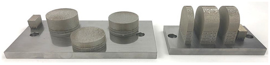 The samples were produced on a Conceptlaser M1 Cuising with a build space of 250 × 250 × 250 mm3. The laser has a power of 200 W and a spot size of 50 µm. Nitrogen was used as shielding gas, and the build plate was not preheated. There was also no post-heat treatment. The material used was 316L powder with a PSD of −45/+15 µm. A maximum of 5% of the particles are larger than 45 µm, and a maximum of 5% of the particles are smaller than 15 µm. In addition to the components, ghost parts have been added to the process, which were scanned by the laser without power in order to equalize the different cooling cycle times between the layers. The cooling speeds and cycle times have an important influence on the resulting part properties. These ghost parts are a common technique to synchronize the cooling cycle times of different build jobs or of parts of one job with different cross-sections over the complete building height. These (not actually printed) scan vectors delay the next recoating cycle by the exact time used to obtain the shortest but most homogenous cycle time over the complete building job.