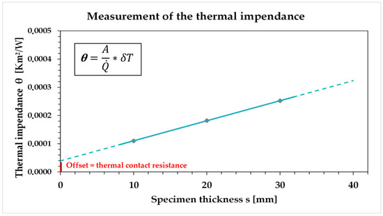 The various samples were measured using the heat flow meter method in accordance with ISO 8301 in the steady state. The sample is therefore positioned between a hot and a cold plate with a set contact pressure. To be able to calculate power losses and contact resistances at the contact surfaces, the thermal impedance was first determined. The thermal impedance of the overall system was calculated in accordance with ASTM D5470, as is normally the case with thermal interface materials. The power loss of the overall system is determined with the aid of three measuring points and a compensation line. The equalization line is extended to the Y-intercept using linear regression. The intersection point gives an average value of the thermal power loss of the overall system (e.g., Figure 2). If this value is subtracted from the individual measured values, the thermal resistance caused by the material alone can be determined, and thus the thermal conductivity of the sample can be determined.