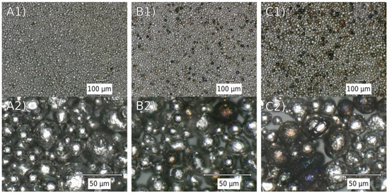 Figure 3. Optical comparison of 316L powder in fresh (A), used and sieved (B), and oversized (C) states. Each powder is shown with 200× magnification (A1C1) and 1000× magnification (A2C2).
