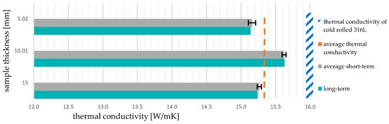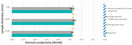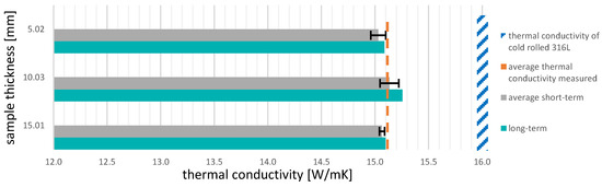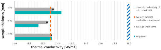 This shows that the slightly lower baseline of the LPBF specimens compared to conventionally manufactured 316L specimens is reached, but also that it stays unchanged in relation to the build-up direction. There were no tests in this study that indicated anisotropic behavior for thermal conductivity. Hypothesis 2 can therefore be regarded as disproven. This presents another important contribution to the state of the art, as microstructure and crystallographic texturing for the 316L material are often related to mechanical properties or corrosion performance but are rarely investigated with respect to thermal conductivity [22,23,25].