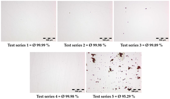 Figure 8. Micrographs for optical evaluation of the density of test series 1–5. The pictures represent one of the five measuring pictures that have been averaged for each series.