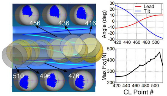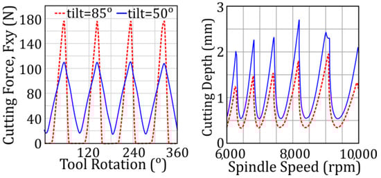The effect of the tilt angle on the cutting forces and stability diagrams is shown in Figure 5. As the tilt angle is increased, the tool axis moves away from the surface normal vector n, and the side of the milling tool starts to engage with the workpiece. In return, the cutting force fluctuation becomes even higher. Moreover, the contribution of the milling tool structure to the dynamic response at the tool tip along the surface normal vector increases when the projection of lateral tool direction on the surface normal vector becomes larger. In return, both the magnitude of the excitation force and dynamic compliance increase, which leads to a decrease in stability limits. The representative case shows a 25% increase in the stability limits with a change in tilt angle from 50 degrees to 80 degrees.