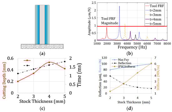 It is observed in Figure 3b that at 5 mm stock thickness, the workpiece is 10 times more rigid than the milling tool. However, as the thickness is decreased to 3 mm, the first mode of the workpiece has almost equal rigidity with that of the milling tool. Once the thickness is decreased to 2 mm, the workpiece FRF reaches double the tool FRF amplitude. However, the FRF is not a decision criterion by itself because the stability limits do not always increase with the increasing stock thickness. This is because higher stock thickness leads to higher regeneration in milling, and hence it may decrease stability. The effect of stock thickness on the absolute stability limits is shown in Figure 3c, where it is seen that increased stock thickness leads to a constant increase in the engagement duration. Hence, the absolute stability limit increase is not possible after 4 mm of stock thickness.