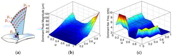 In a representative finish milling of a blade geometry, shown in Figure 6a, the effect of material removal and machining location is simulated. Variations in the magnitude and natural frequency of the dominant mode are plotted in Figure 6b and Figure 6c, respectively. It is observed that the magnitude of the dominant mode significantly varies on the part surface. For instance, at point p1,1 (u = 0 and v = 1), the magnitude of the dominant mode is around 60 units, whereas it reaches up to 120 units at point p1,10 (u = 1 and v = 1). And in between these two points, the magnitude shows a convexly decreasing variation. Moreover, the dominant mode also shifts with material removal and machining location (see Figure 6c). For instance, at p1,10 (u = 1 and v = 1) in Figure 6a, the dominant mode is at a natural frequency of around 2 kHz, which increases up to a level of 5 kHz at p1,1 (u = 0 and v = 1).