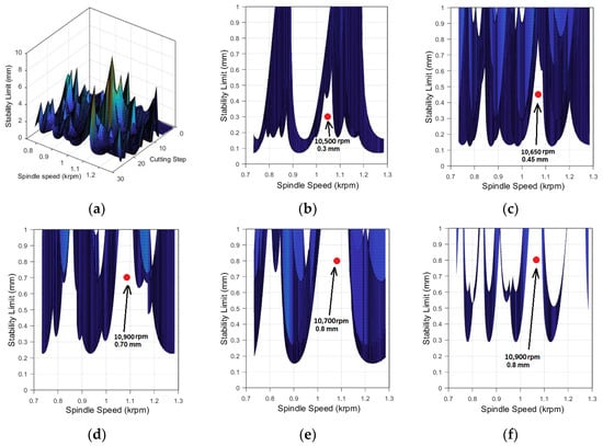 For instance, in Figure 7b, the sweet spot is seen at 10,500 rpm and 0.3 mm depth of cut from cutting step 1 to cutting step 5. However, this changes to 10,900 rpm at 0.70 mm from cutting step 11 to cutting step 15. This is implemented throughout the grouped cutting steps by tracking the variation of the stability diagrams along the −v direction.