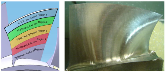 Observing the variation of the stability diagrams and considering the practical application, the blade surface is divided into five segments along the axial (v) direction. At each segment, rather than selecting the same cutting depth, it is adjusted based on the change in absolute stability limits corresponding to the specific common stability diagram. However, considering the horizontal (spindle speed axis) shift in the stability diagrams, the spindle speed is also changed at each section. The sections and corresponding cutting parameters are shown on the blade surface in Figure 8. The machined surface is observed to be free of chatter marks; however, the vertical marks are optically generated due to the machine tool motion dynamics.