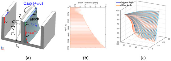 The variable stock shape is implemented by modifying the tool path just before the finish milling stage, i.e., semi-finishing. To define the variable stock shape, the variation of stock thickness is written as a parametric function along the feed (u) and cross feed (v) directions. In this modification, curvature (G2) continuity is critical to have smooth milling tool path tracks. Thus, the shape of the parametric function is selected accordingly. In this study, sinusoidal variation is used along the u direction, and piecewise exponential variation is used along the v direction, as shown in Figure 9a. Consequently, the stock thickness, t(u,v) is written by Equation (1):