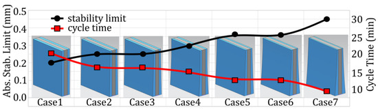 Absolute stability limits are calculated using the simulated FRF of the generated near-net shape IPW volumes. Then, cycle times are calculated using the corresponding axial depth of cut and spindle speed values as compared in Figure 10. It is seen that cycle time can be decreased from 20 min to 10 min.