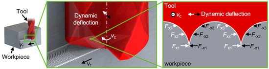 While a variety of approaches to the use of structured tools have been described in the literature so far, process dynamics are only rarely addressed in this context [64]. Suzuki et al. developed and analyzed a cutting tool modification based on a flank face texture which decreases the effective clearance angle γe, which enables a reduction in the vibration amplitude in validating face turning experiments from 45 to less than 5 µm at a low cutting velocity [21]. Baumann et al. presented an approach for disturbing the regenerative effect in milling processes, which is based on an optimization of the tool shape. By attaching structure elements to the flank face of the minor cutting edges of a milling tool, the process window could be shifted to higher stability limits compared to a non-optimized milling reference tool [5]. This approach enables a universal use, allowing an increase in the process limits without the need for comprehensive measurements and analyses of dynamic system characteristics. Figure 1 illustrates the underlying working hypothesis of their tool concept. The circularly applied structure elements interact with the workpiece material during the cutting process and constitute a beneficial guidance of the arc-shaped elements along the trajectory of the cutting velocity. In this way, a radial support effect is generated, which counteracts the dynamic deflections of the milling tool. Furthermore, the approach aims to dissipate kinetic energy by means of friction effects and plastic material deformations between the structure elements and uncut workpiece surface material in order to dampen tool vibrations. With the increased roughness values of machined workpiece surfaces, thermal loads and complex tool wear distributions, a number of side effects occur in milling processes as a result of structure element application [5].