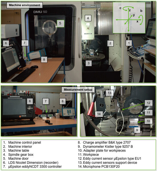 Ramp milling tests were carried out to investigate numerous influences on the stability behavior of the presented tool concept and for its further development. In Figure 2, an overview of the used five axis milling machine DMG MORI DMU 50 evolution II with the installed experimental setup including the measurement technology is given.