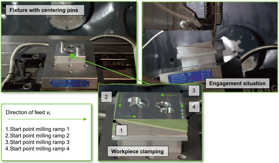 Figure 3 illustrates the used clamping setup and provides a specific view of the engagement situation between tool and workpiece during the milling tests. In order to ensure identical conditions for all ramp milling tests, the test specimens were milled at right angles and to the same dimensions beforehand. In addition, they were provided with a drilling pattern to enable repeatable, centered placement and fastening on the force dynamometer. Thanks to the pinning, all test specimens share the same workpiece origin, meaning that a probing process was only necessary once. This was also a basic requirement for carrying out the large number of ramp milling tests, as changing the tool holder before each milling test would have resulted in a recalibration of the eddy current sensors. Due to the workpiece preparation, it was also possible to carry out ramp milling tests on all four workpiece sides, as suggested below in Figure 3.