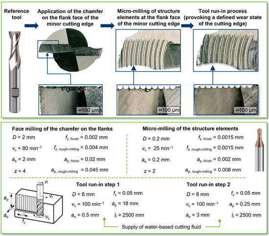 Potential wear on the HSS tools has to be taken into account with regard to possible influences on the test results. In order to exclude wear-dependent variations in the engagement conditions in the ramp milling tests as far as possible, the HSS test tools were subjected to a running-in process after the structures were applied. As shown schematically in Figure 5, a defined, respectively leveled wear condition of the cutting edges was applied in two separate sub-running-in processes for the circumferential cutting edges and the structured flank faces. A water-cutting fluid based on ECOCOOL TN 2530 oil (FUCHS) was used during these processes. Based on Baumann’s investigations on wear development with regard to this tool concept, a defined feed path length of lf to be covered was determined. The milling path of lf = 2500 mm for each sub-run-in process was based on Baumann’s investigations for comparability. These showed that a running-in process of the structured HSS milling tools is important in order to ensure constant test conditions [5].