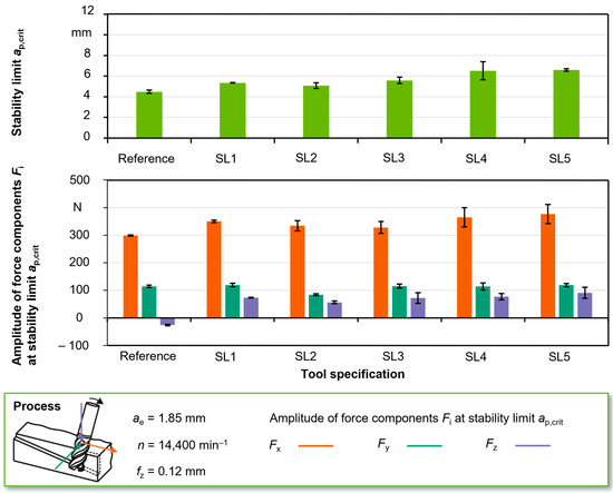 For the SL5 tool with the largest chamfer depth of dch = 0.4 mm, there is a maximum stability limit of ap,crit = 6.59 mm, which corresponds to an increase of 44% compared to the reference process and 30% compared to the process with the SL2 tool (ap,crit = 5.08 mm). Contrary to this trend, the stability limit for the SL1 tool is slightly higher at ap,crit = 5.32 mm, despite the lower depth of the chamfer dch. In this context, however, it should be mentioned that all 10 structure elements are first fully developed at the chamfer depth of the second tool SL2 at dch = 0.1 mm. At smaller chamfer depths, the chamfer is not wide enough. Therefore, the deviation of the trend for tool SL1 is only of limited significance in this context. In the comparison (Figure 7) of the stability limits achieved and the amplitudes of the process force components, it can be seen that cutting forces occur predominantly in the Fx and Fy directions, which shows a strong correlation to the trend of the achieved stability limits.