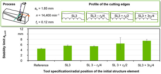 By means of a stability lobe diagram and accompanying experimental milling tests, a reference process at a stable spindle speed and the milling parameters listed below in Figure 7 were defined in preliminary investigations. With this process parameter configuration, a stability limit of ap,crit = 4.59 mm for the reference process with an unstructured HSS milling cutter was achieved. For the structured tool SL5 with the highest depth of the chamfer dch, this frequency even seems to disappear completely in the process area before the stability limit ap,crit is reached. This may indicate that externally excited vibrations can be damped as a direct result of the applied structure elements. It is clearly evident from the results of this test series shown in Figure 7 that a successive increase in the stability limit for this type of tool can be achieved with an increasing structure length.